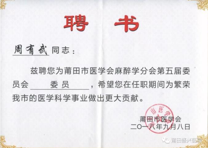 熱烈祝賀盛興醫(yī)院麻醉科主任   周有武當(dāng)選莆田市醫(yī)學(xué)會   麻醉學(xué)分會第五屆……