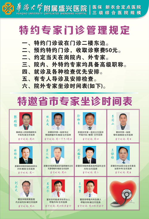 好消息,莆田盛興醫(yī)院即日起,在門診二樓東邊開設(shè)“特約醫(yī)生門診”,特邀部分省市醫(yī)生來院多點(diǎn)執(zhí)業(yè),定期坐診。另外還有部分院內(nèi)醫(yī)生,醫(yī)生們均具備調(diào)級職稱。