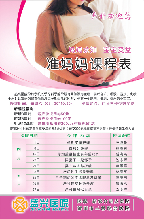 我院“孕婦學校”每周六上午開課,聽課人數(shù)30人以上,已有近萬名孕婦受益。為答謝廣大孕婦對醫(yī)院支持與信任,推出各項優(yōu)惠政策: